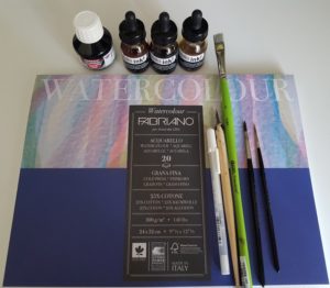 - 300 grams aquarelpapier van Fabriano, Cold Press, fijne structuur, 25% katoen, zuurvrij, FSC-gecertificeerd papier